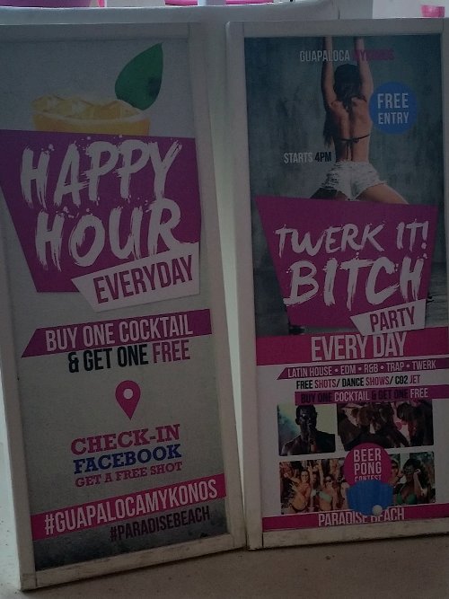 Whether or not you are into clubbing and partying, it is worthwhile visiting Paradise Beach on Mykonos simply to dip your toes into the beautiful sea and do some colourful people watching. Located on the south end of the island you will find some funky beach clubs and bars with prime location: right on the beach. Paraga and Paradise are the main areas for clubbers and party goers, with popular beach parties hitting off at 5pm and going on into the early hours of the morning. If you like sick beats, sexy dancers and a g-string clad host, Tropicana Club is definitely where it’s at. There are also hotels and campsites nearby for those who never want to stop partying. The evening we went, we felt about 15 years too old to be there, or at least far too sober. It didn’t stop us from enjoying the music and even getting a photo with the host of the evening. After a quick dance and drink, we were happy to move onto quieter parts of the island to enjoy some delicious food with breathtaking views. Like I said, you don’t have to be a fresh-faced teenager (or an alcohol-infused partier) to enjoy Paradise Beach and the party scene; in fact, you may enjoy it more, or at least remember the experience.